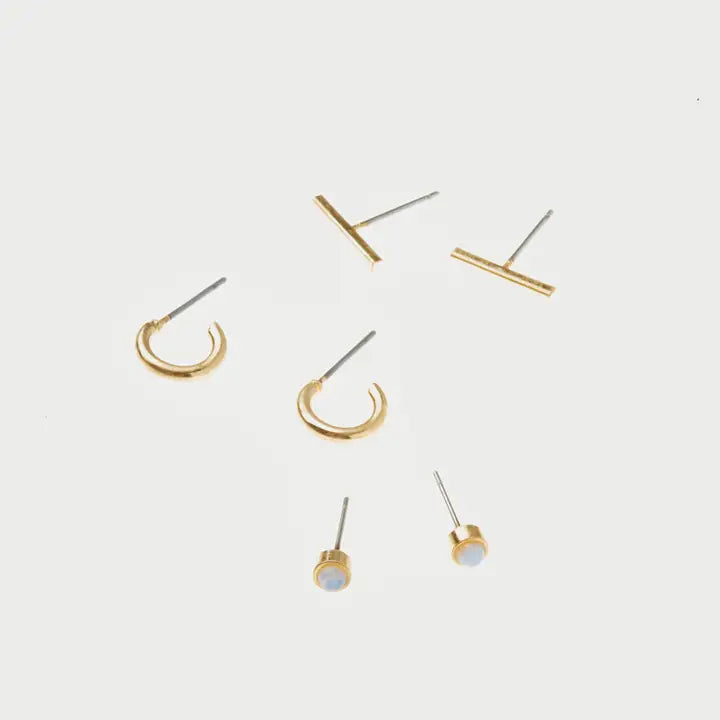 Set of three studs • Materials: brass, semi-precious stone • Nickel and Cadmium free • Hypoallergenic • Earrings come on a real leather card with gold foil. Opalite | Stone of Healing